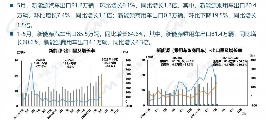 5月汽车出口55.1万辆,同比增长14.5%,其中新能源汽车成为核心驱动力:新能源汽车出口21.2万辆,同比激增120%,占出口总量38.5%;其中,插电混动车型出口7.4万辆,增速高达240%,远超纯电车型79.8%的增幅;前5月新能源汽车出口85.5万辆,同比增长64.6%,插混车型增长达2倍。另据市场研究公司Dataforce当地时间6月24日公布的数据显示,今年5月,中国汽车品牌在欧洲的销量同比增长85%,超过6万辆。